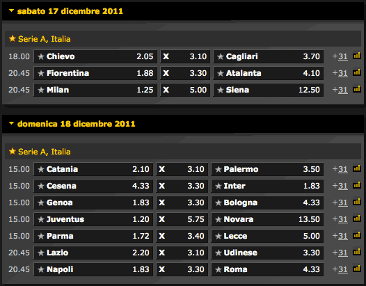 Quote serie A di Bwin aggiornate al 16 dicembre 2011 ore 17:30